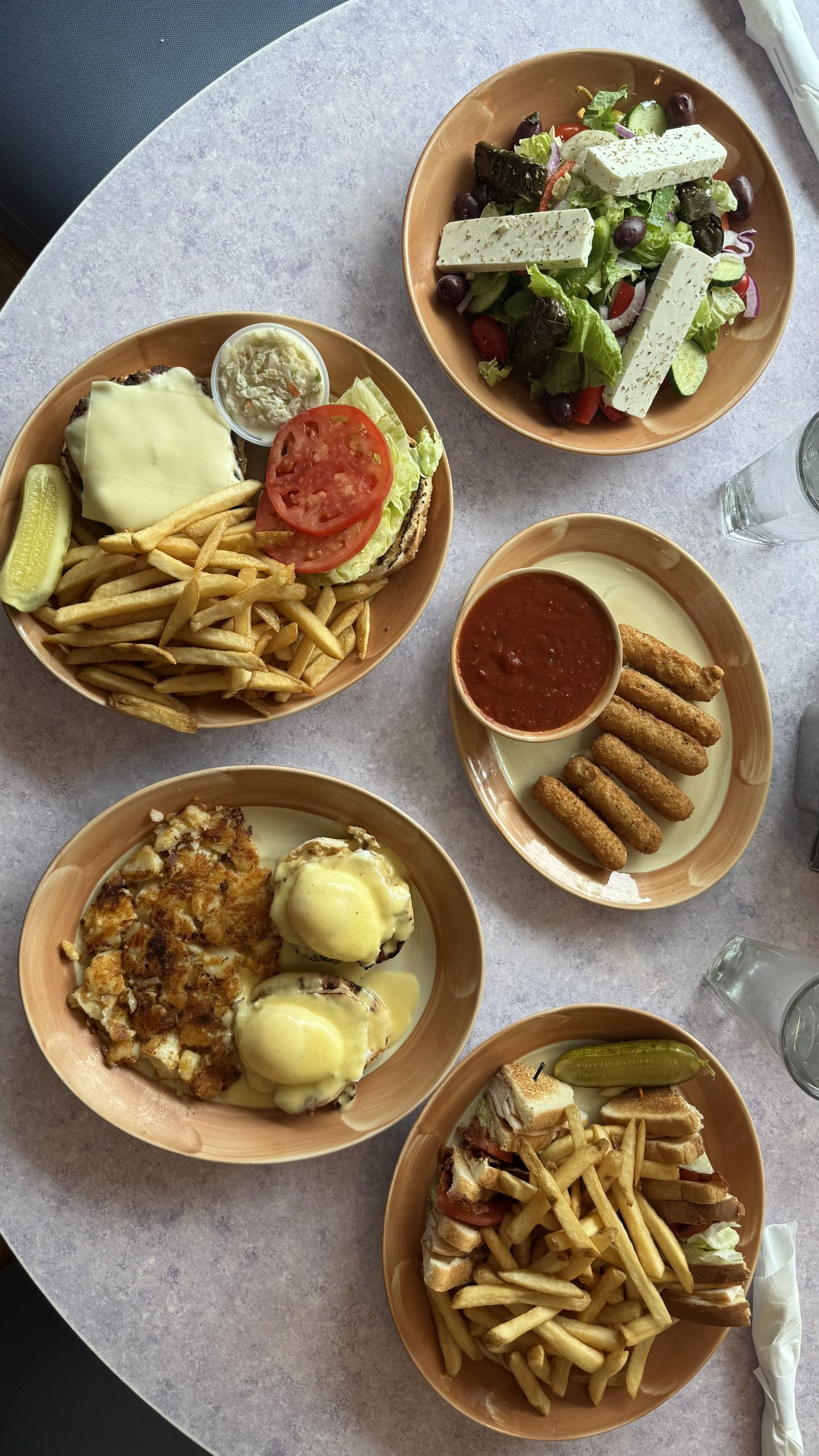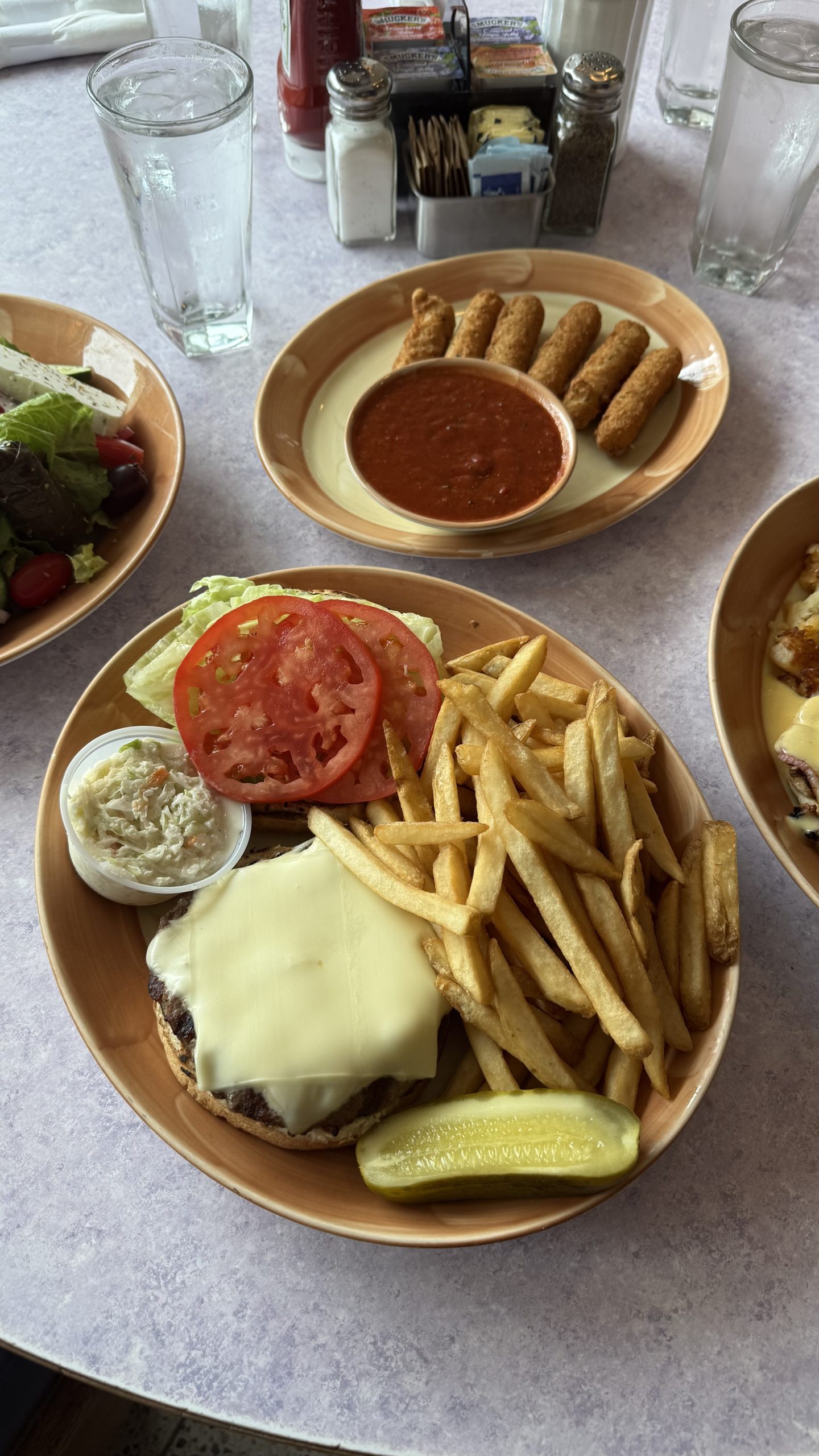 What a great, old-fashioned diner experience. The menu was huge and included all of the classic diner staples. There was a massive breakfast section, plus dinners and specials. My husband got a cheeseburger deluxe that was very good (but was missing the coleslaw and pickle sides). My spanakopita was quite good in flavor, the bottom crust was a little soggy but the top was flaky and delicious. They do charge for each soft drink refill. We would return in a heartbeat if we’re in the area.